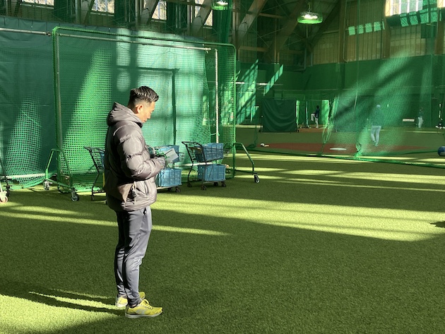 「チーム宿舎から球場までの始発バスは8:00ですが、自転車で来て早出練習をする選手もいます。よって7:30には、室内練習場に確実にいるようにしています。照明をつけて、窓を開けていくという流れです」